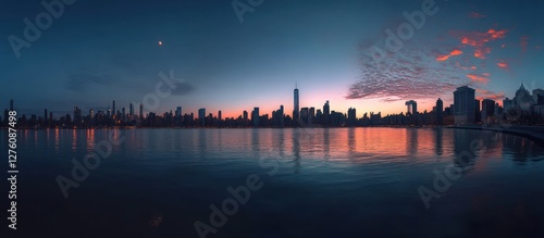 © lisa, Fototapeta premium Cityscape Sunrise, Water Reflection, Dramatic Sky