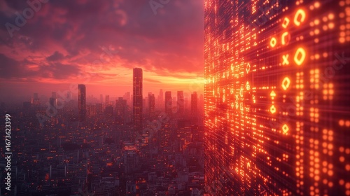 Naklejka premium Cityscape sunset; data wall; futuristic code