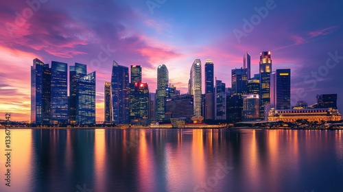 © Pianart, Fototapeta premium Cityscape sunset, harbor reflection, vibrant sky, Asia