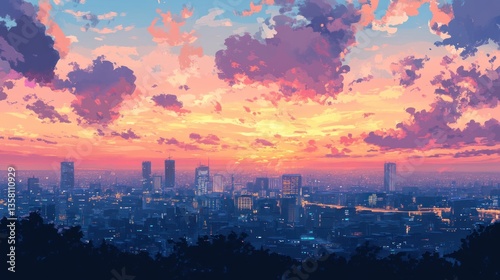 © Berkah1789, Fototapeta premium Cityscape Sunset Painting Vibrant Colors Skyline
