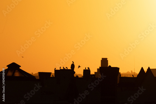 © Rajesh, Fototapeta premium Cityscape sunset silhouette with bird flying over.