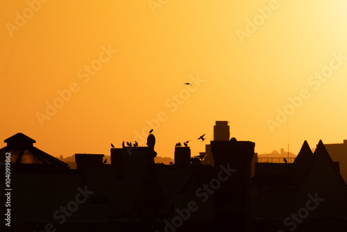 © Rajesh, Fototapeta premium Cityscape sunset silhouette with bird flying over.