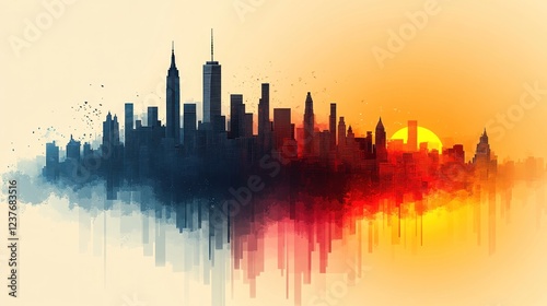© Erisna Yolanda, Naklejka premium Cityscape sunset, urban skyline reflection, birds flying, sunrise background