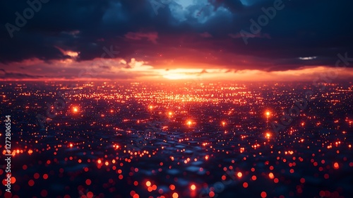 Fototapeta premium Cityscape sunset, vibrant lights, dramatic clouds, aerial view, background...