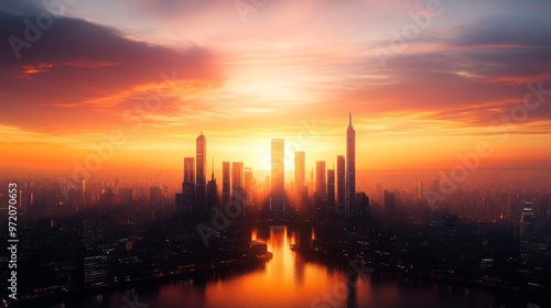 © Panupan, Fototapeta premium Cityscape Sunset with Golden Sky and River Reflection