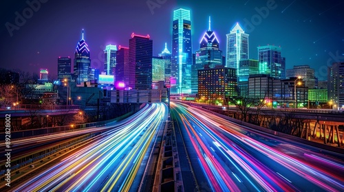 © AbiScene, Fototapeta premium Cityscape Symphony Dynamic Urban Nightscape with Speeding Light Trails and Dazzling Skyscrapers