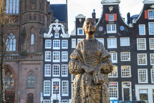 Obraz premium Cityscape - the statue Vrouw met Stola (Woman with stole) is located next to the Siegel canal in the historic center of Amsterdam, the Netherlands