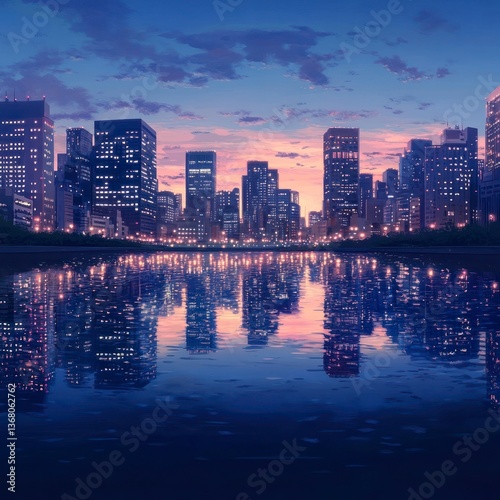 Fototapeta premium Cityscape twilight reflection, urban water scene