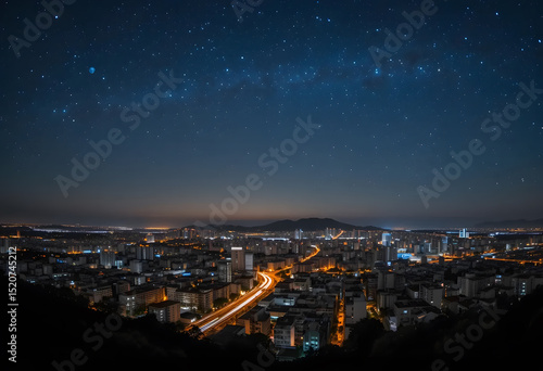 Obraz premium Cityscape under a Starry Night Sky with Light Trails