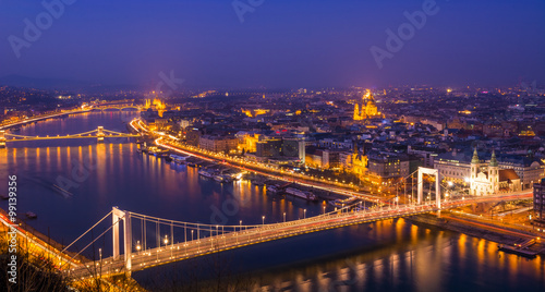 © cristianbalate, Fototapeta premium Cityscape view of Budapest capital in evening lights, bridge and landmarks illuminated in Hungary