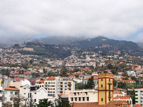 © Philip J Openshaw , Fototapeta premium cityscape view of funchal in madeira with typical white painted buildings old church and bridge with tree covered mountains under white clouds