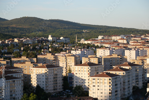 © Towfiqu Barbhuiya , Fototapeta premium Cityscape view of residential buildings and mountains in daylight