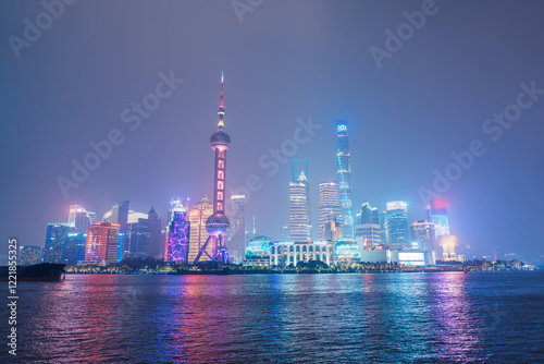 Naklejka premium Cityscape view of Shanghai city at night. Skyscraper of Lujiazui in Pudong, view from The Bund of Shanghai, China. landmark and popular for tourism attractions. Travel and Vacation concept