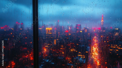 © julio, Fototapeta premium Cityscape view through a rain-soaked window at dusk.