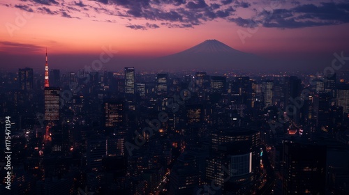 © Zoro, Obraz premium Cityscape view with Fuji at sunset.