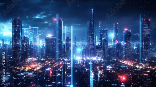 © abdul kahfi, Fototapeta premium Cityscape view with neon lights at night