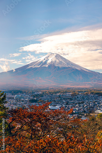 Obraz premium Cityscape views of the city near the volcano in the autumn from the Chureito Pagoda, Japan. There is Mount Fuji with snow on the top with a clear blue sky. There are colorful houses and buildings.