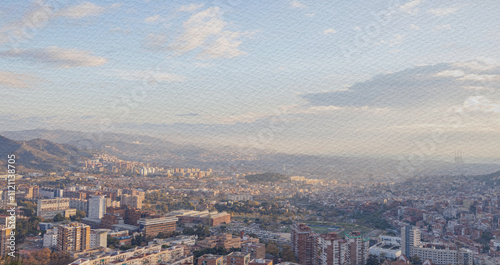 © Sergei, Fototapeta premium Cityscape with a cloudy sky and a mountain in the background
