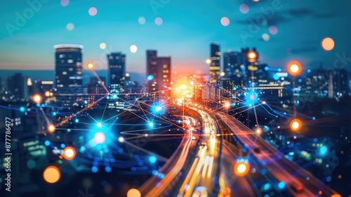 © Ariep, Fototapeta premium Cityscape with Abstract Network Connections at Night