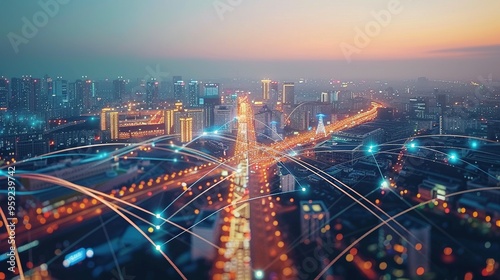 © Ahmad-Muslimin, Fototapeta premium Cityscape with Abstract Network of Lights at Dusk
