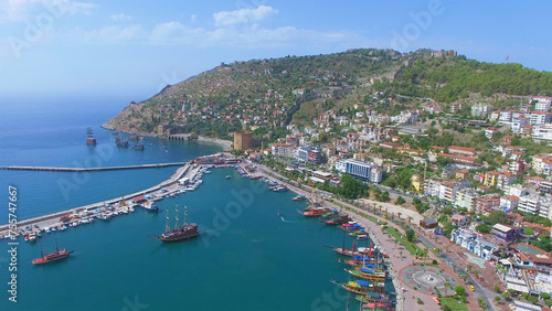 Fototapeta premium Cityscape with Alania Sea Port at summer sunny day. Aerial view videoframe