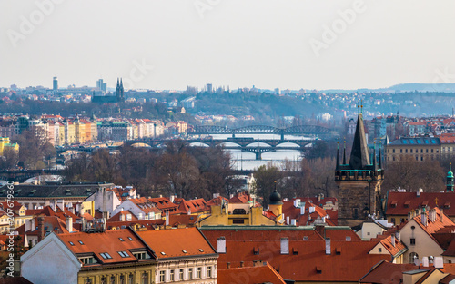 © aerial333, Obraz premium Cityscape with bridges on Vltava river in Prague, Czech Republic