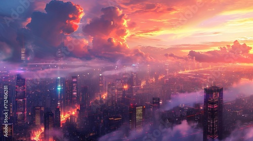 Fototapeta premium Cityscape with clouds and lights at sunset