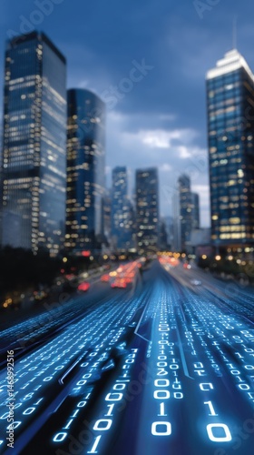 Fototapeta premium Cityscape with Data Stream Overlay: Technology, Futuristic, and Night Life Concept