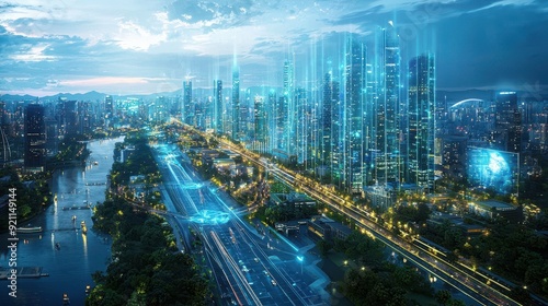 © MediaStockAI, Fototapeta premium Cityscape with Digital Network