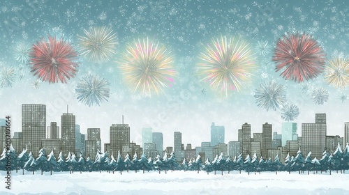 Obraz premium Cityscape with fireworks exploding over a snowy forest.