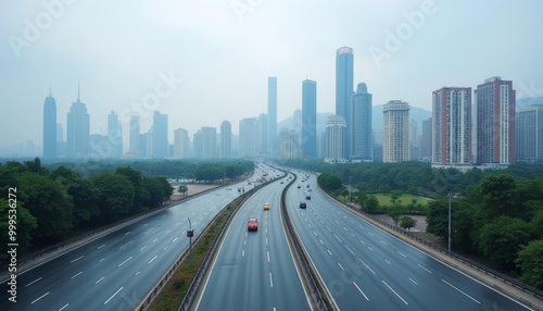 © SwathiFX, Fototapeta premium Cityscape with highway and skyscrapers under a cloudy sky