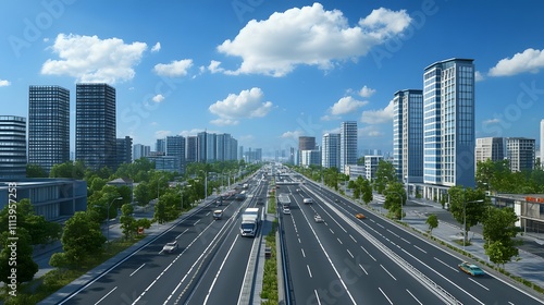 Fototapeta premium Cityscape with highway, buildings, and greenery under a blue sky.