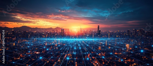 © upnowgraphics, Fototapeta premium Cityscape with Illuminated Buildings and Digital Network Connections at Sunset