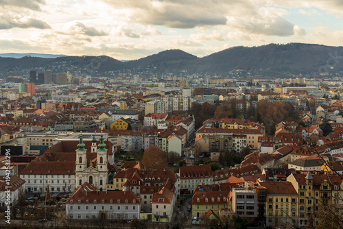 Fototapeta premium Cityscape with Red Tile Roofs, Church Towers and Hills