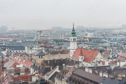 Naklejka premium Cityscape with red tiles rooftops and church tower of the old town of Vienna...