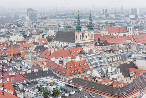 © zz3701, Obraz premium Cityscape with red tiles rooftops and tower of Jesuit Church of the old town of Vienna in a heavy snowy day. View at the tower of St. Stephen's Cathedral in Vienna, Austria.
