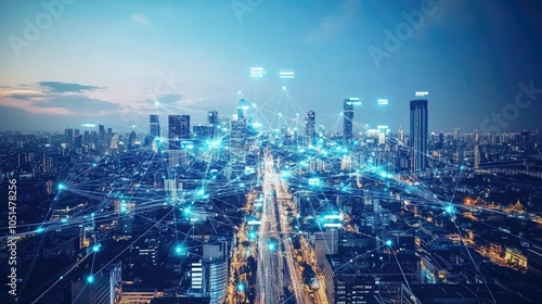 Fototapeta premium Cityscape with skyscrapers, digital connections, and various transportation...
