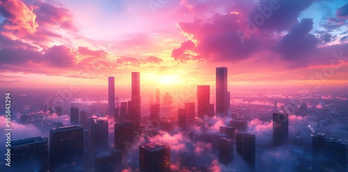 © Kind Bee Studio, Fototapeta premium Cityscape with skyscrapers piercing the pink clouds at sunset.