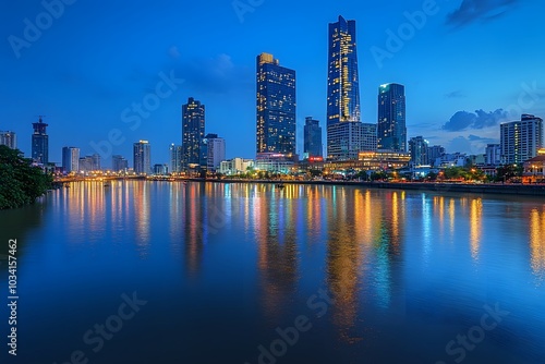 © irawan, Fototapeta premium Cityscape with Skyscrapers Reflected in a Calm River at Twilight