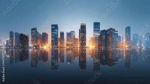 © 志华 崔, Fototapeta premium Cityscape with Skyscrapers Reflected in Water at Dusk