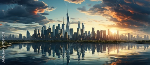 Fototapeta premium Cityscape with skyscrapers. Sunlight with gray clouds