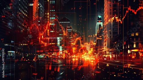 © atar, Obraz premium Cityscape with stock market chart overlay, showing economic growth and development