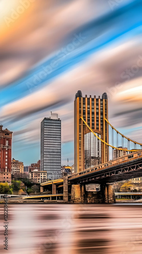 © Siasart, Fototapeta premium Cityscape with Suspension Bridge and Skyscrapers under a Streaked Sky Beautifully