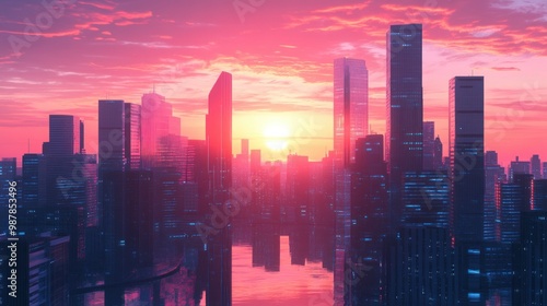 © Rere_Art151, Fototapeta premium Cityscape with Tall Buildings and Sunset Reflections