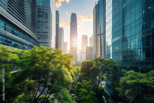 © Ifti Digital, Naklejka premium Cityscape With Tall Buildings and Trees in the Foreground, Glass and steel skyscrapers in an eco-friendly cityscape, AI Generated