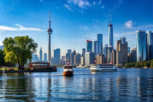 © Abubakar, Fototapeta premium Cityscape with Tower, Boats, and Blue Sky