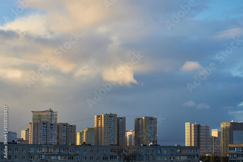 © Ryzhkov Oleksandr, Fototapeta premium Cityscape with Towering Clouds and Evening Light