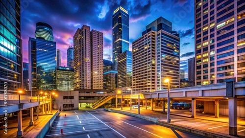 © Man888, Fototapeta premium cityscape with towering skyscrapers, neon lights, and bustling streets, juxtaposed with a dimly lit parking garage entrance in the foreground.