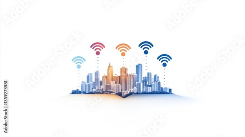 © MAVIS, Fototapeta premium Cityscape with Wireless Signals Representing Connectivity and Technology