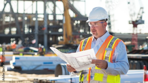Fototapeta premium Civil Engineer Reviewing Blueprints at a Bustling Construction Site at Sunset